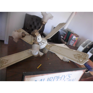 white with gold trim ceiling fan. with lights, good condition.I have 3 similar but not exact